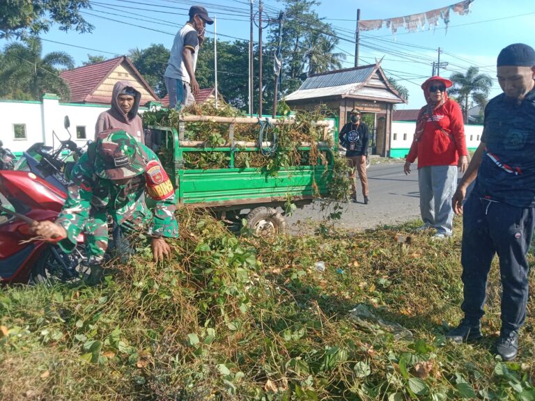 Dengan penuh semangat Personel Koramil 04 bersama dengan warga Galesong bergotong royong melaksanakan pembersihan lingkungan dimulai dari membersihkan sampah-sampah dan rumput liar di pinggir lapangan Larigau pengangkatan tanah dari selokan.