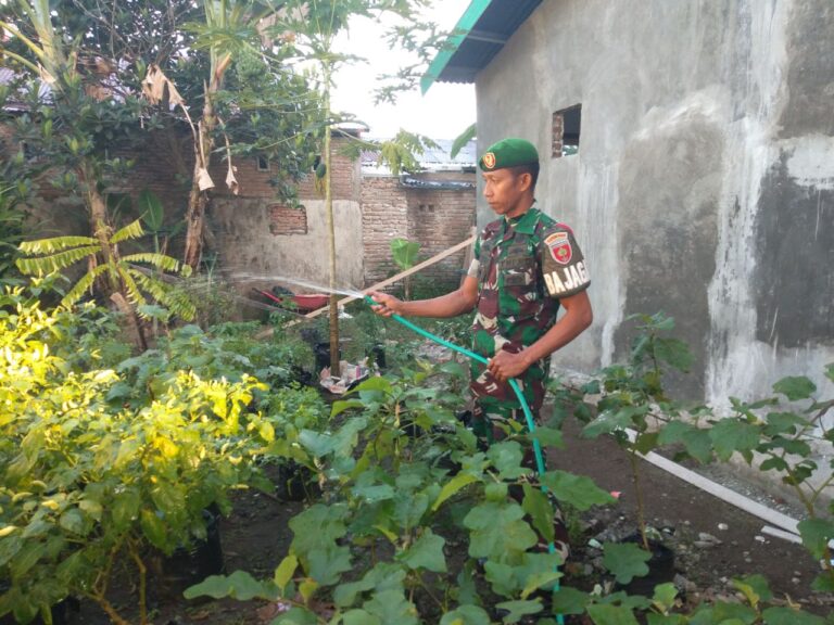 Retorika.co.id, Takalar – Piket Koramil 1426-04/Galesong, Kodim 1426/Takalar, Serda Muh. Yusuf tampak sedang merawat tanaman yang memanfaatkan lahan kosong dengan menanami tanaman produktif. Pekarangan Kantor Koramil dijadikan lahan pertanian dengan membuat bedengan/rak polibag, dan Kolam ikan yang diisi dengan berbagai jenis tanaman dan ikan. Sabtu, (19/07/2025)