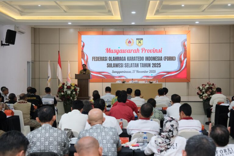 Retorika.co.id, Gowa – Ketua Komite Olahraga Nasional Indonesia (KONI) Sulawesi Selatan, Darmawangsyah Muin resmi membuka Musyawarah Provinsi (Musprov) Federasi Olahraga Karate-Do Indonesia (FORKI) Sulawesi Selatan di Aula Cemara, Palantikang, Kabupaten Gowa, Kamis 27/11/2025.